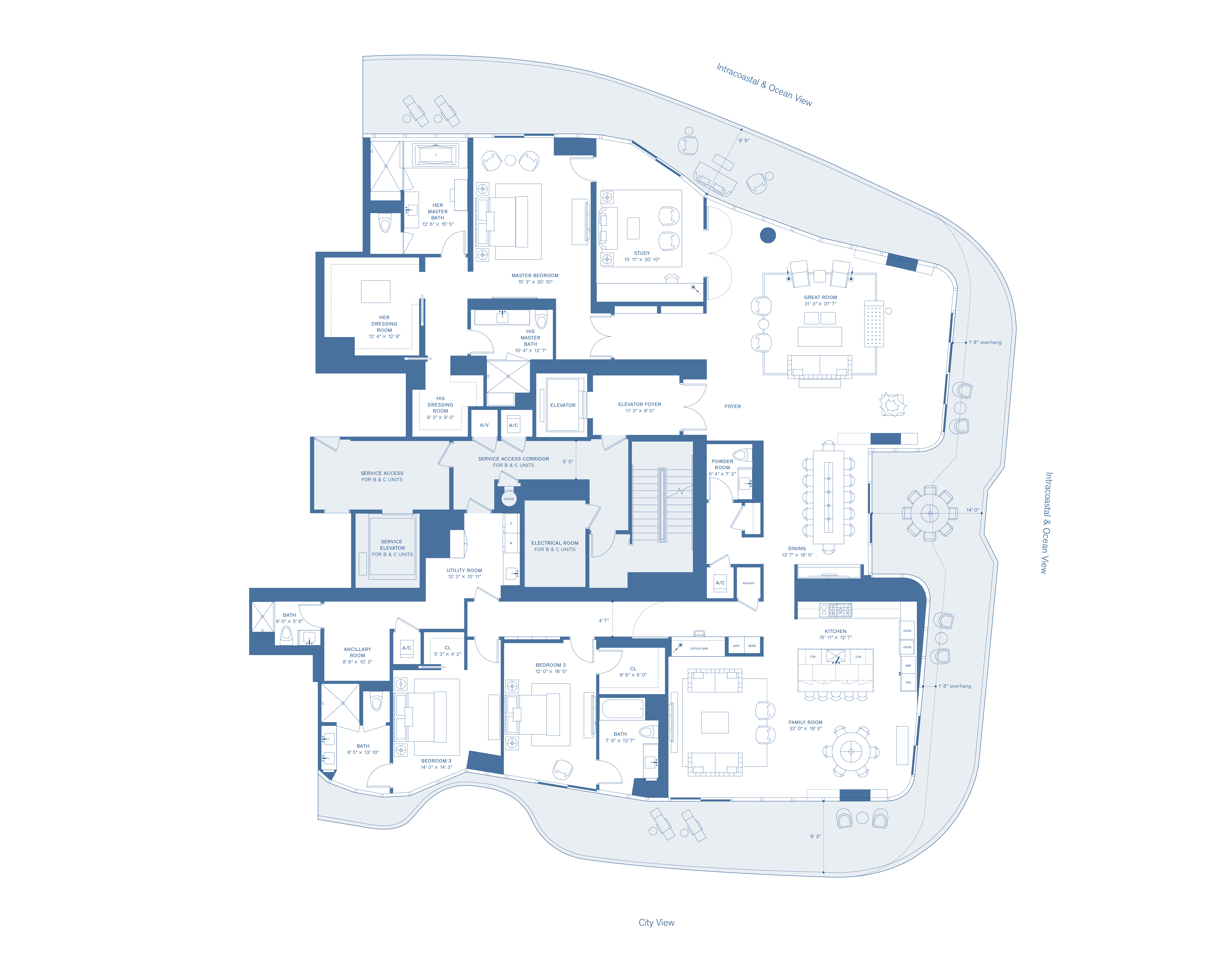 - Private elevators open directly into each residence, with separate service elevators for staff and deliveries.