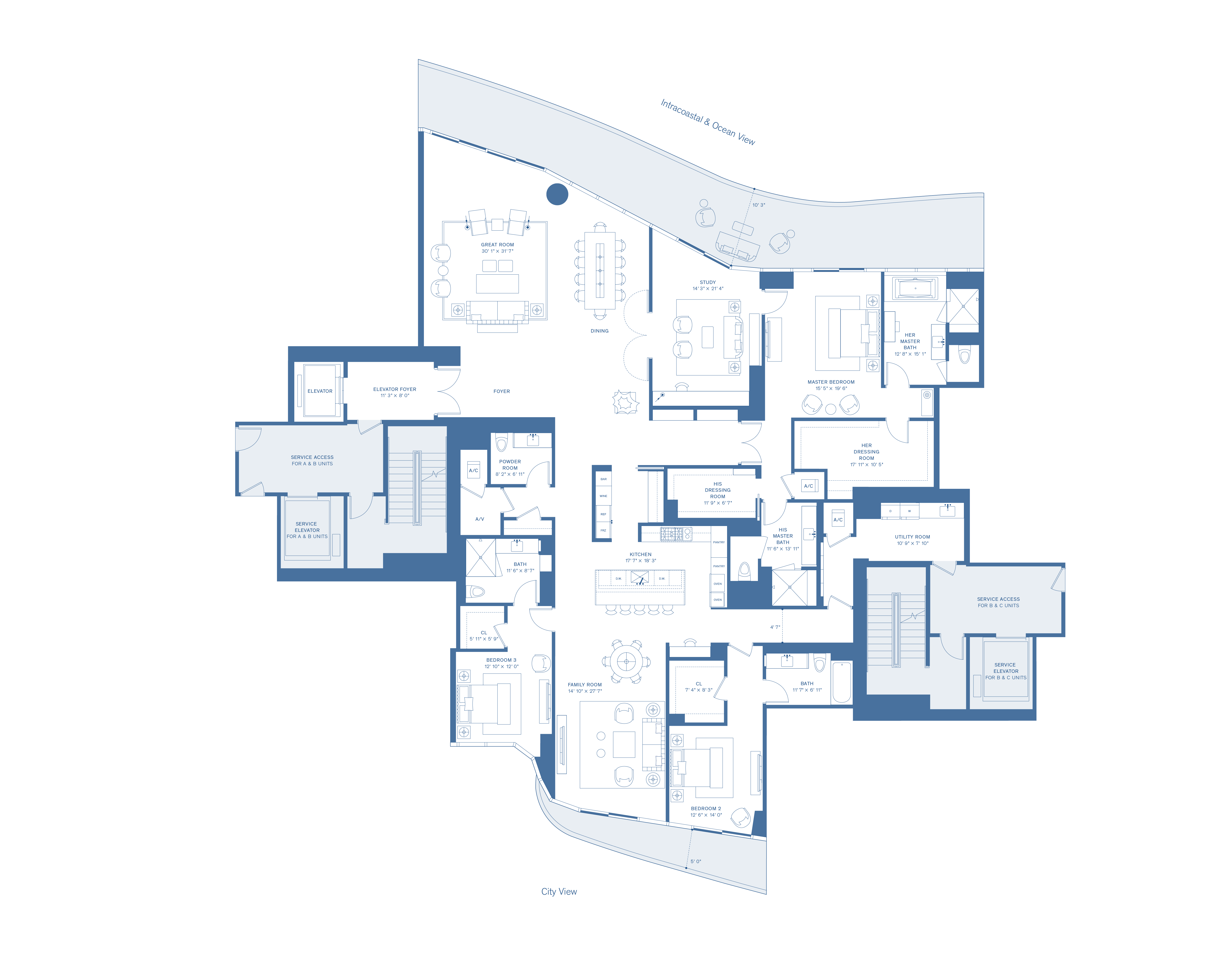 - Private elevators open directly into each residence, with separate service elevators for staff and deliveries.