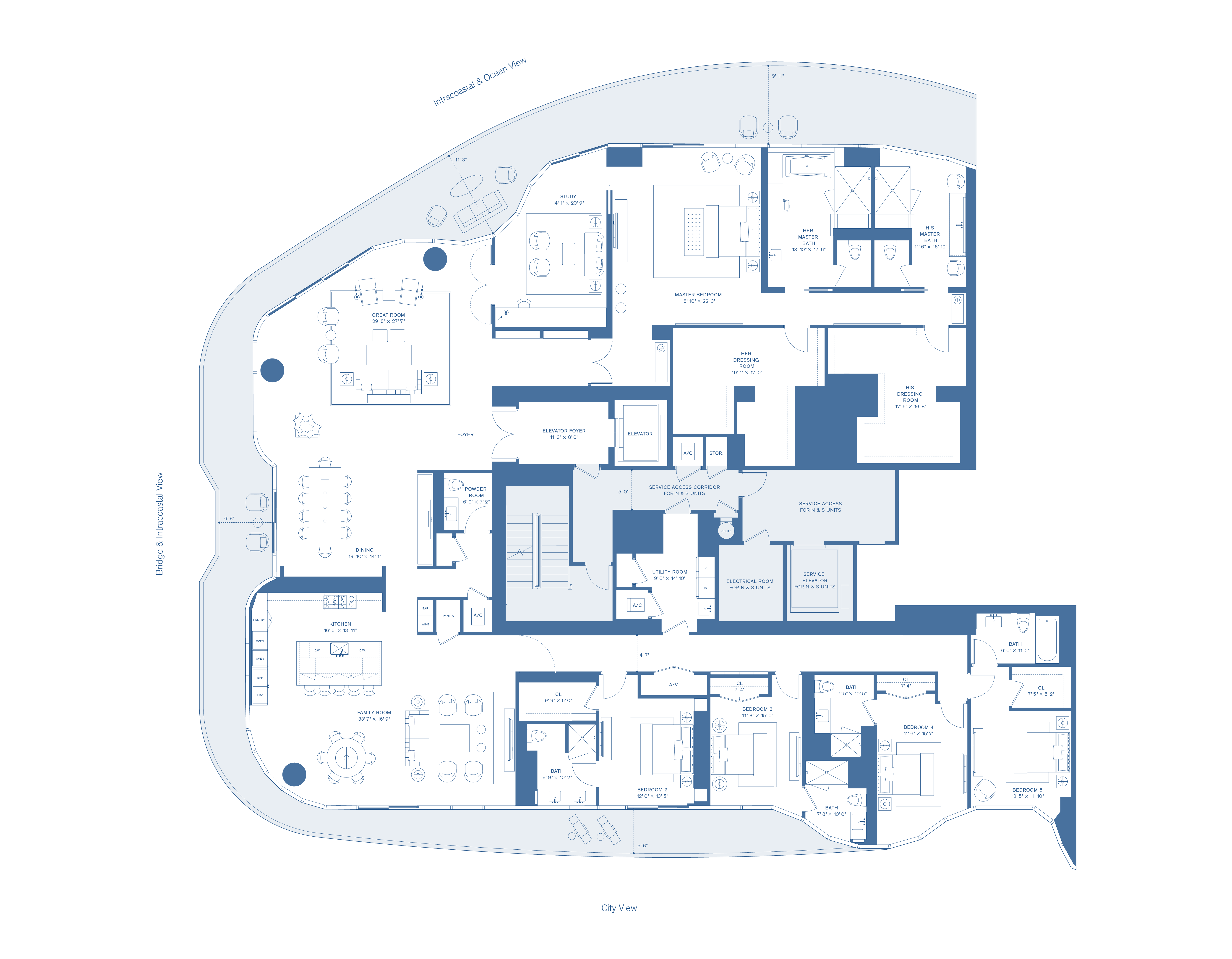 - Private elevators open directly into each residence, with separate service elevators for staff and deliveries.