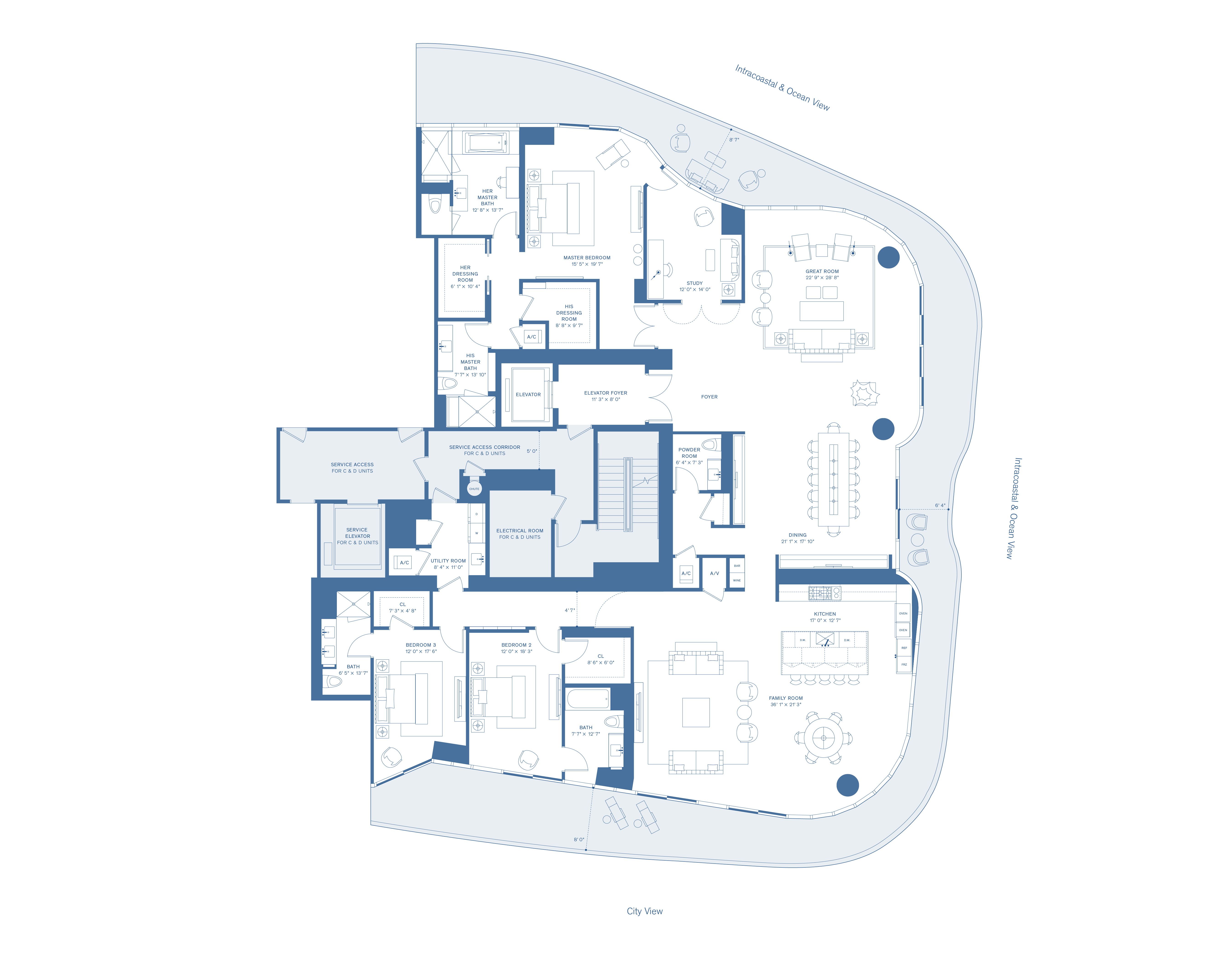 - Private elevators open directly into each residence, with separate service elevators for staff and deliveries.