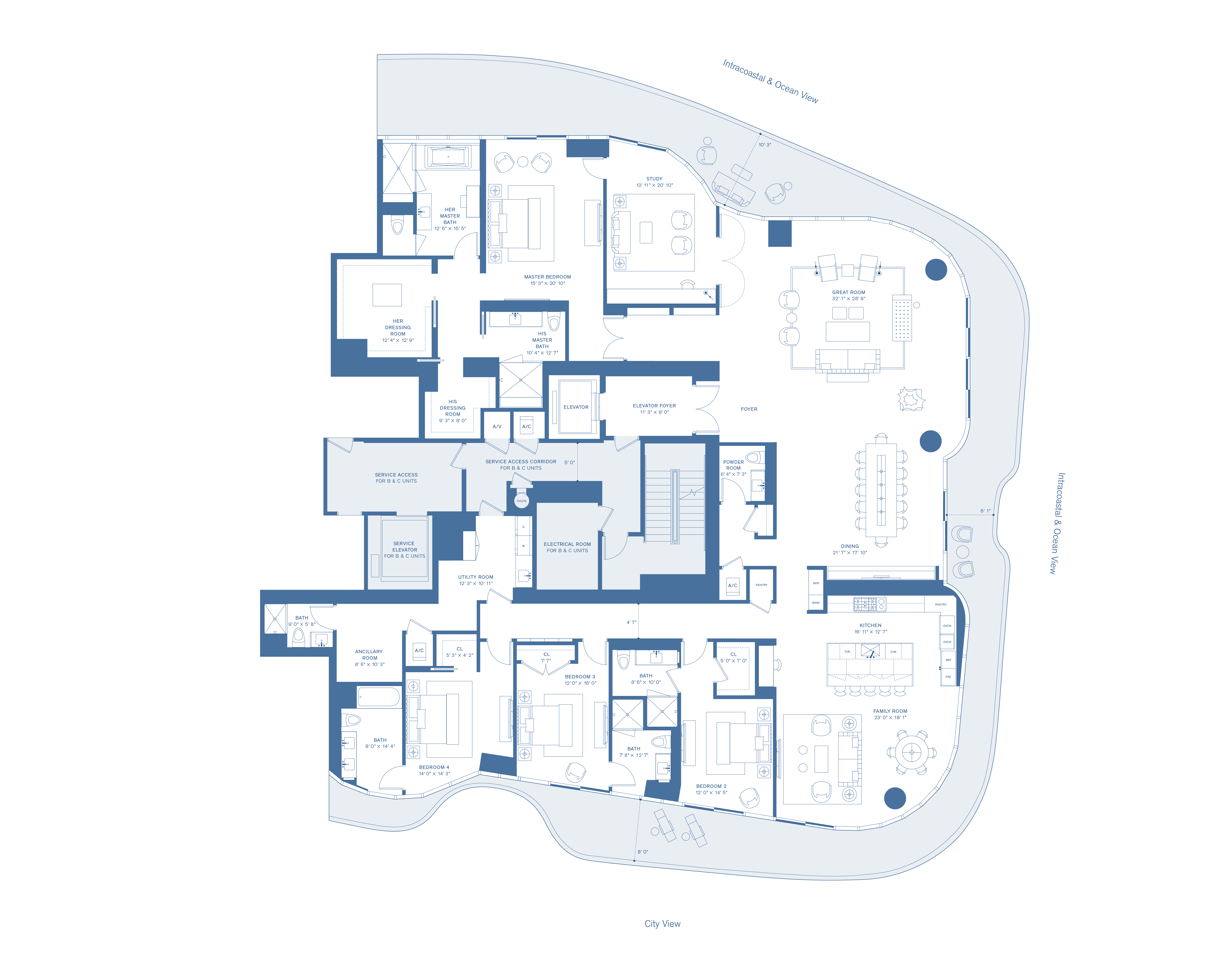 - Private elevators open directly into each residence, with separate service elevators for staff and deliveries.
