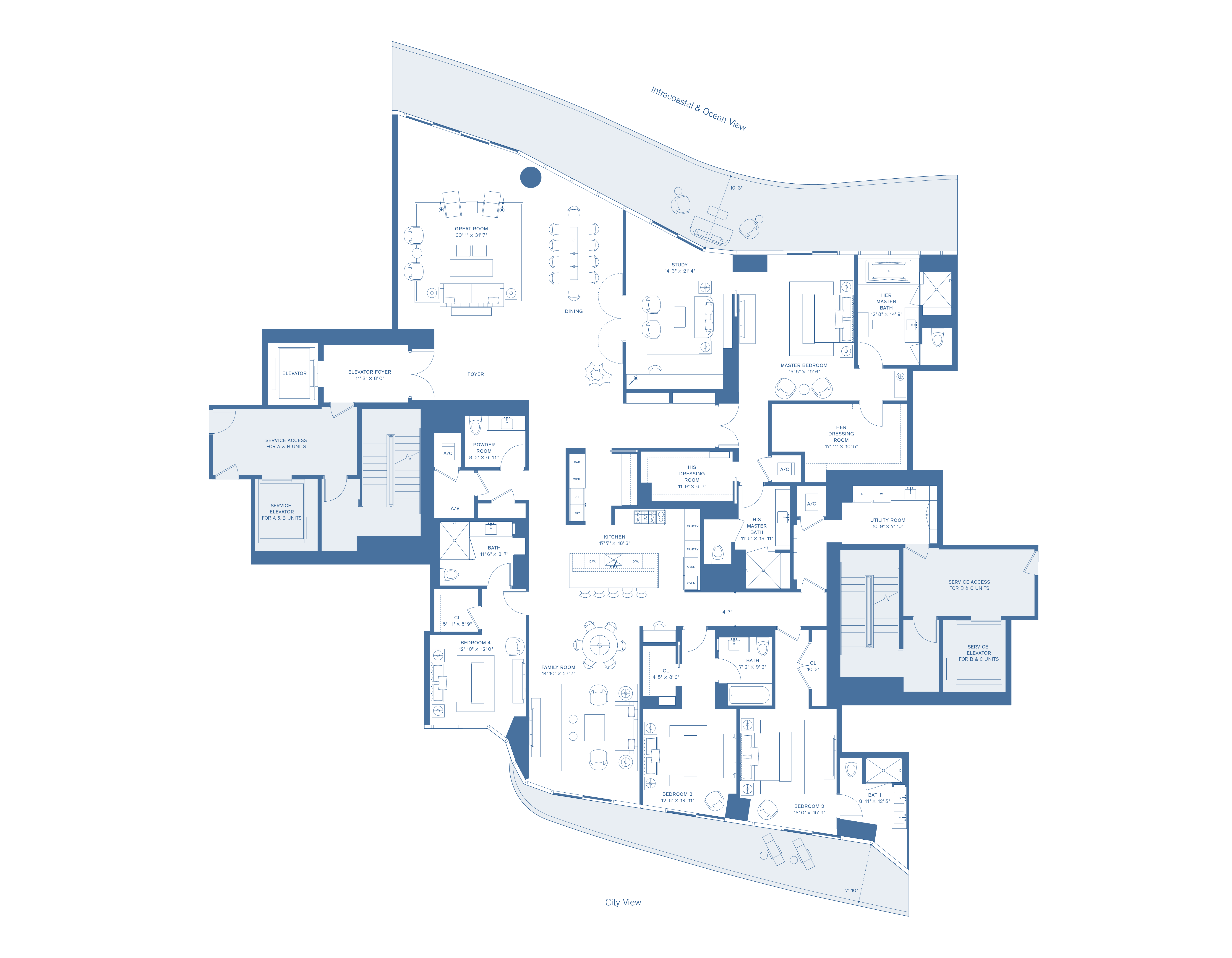 - Private elevators open directly into each residence, with separate service elevators for staff and deliveries.
